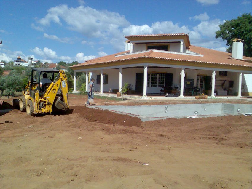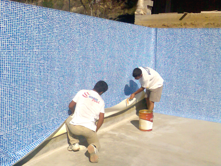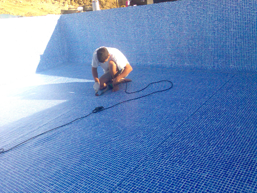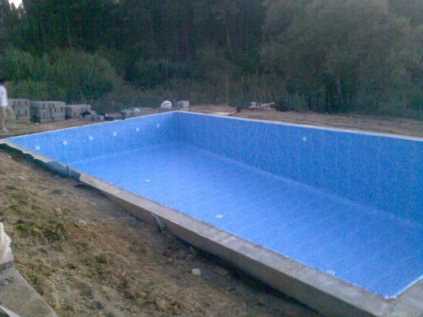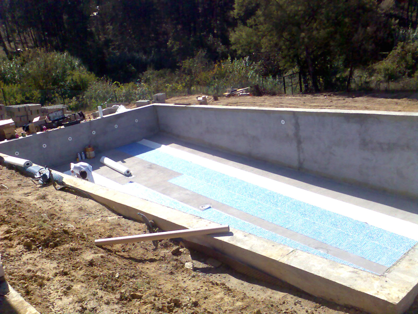 A estrutura é feita, em geral, em betão armado ou em alternativa; a construção do fundo do tanque em betão armado e malha de ferro cruzada, as paredes em alvenaria reforçada com pilares e lintéis. Após a parte da estrutura feita, segue-se a colocação de revestimento em tela PVC e uma membrana armada com 1,5 mm de espessura, constituída por uma "folha" de PVC, reforçada por uma malha de poliéster A sua montagem no local é realizada por meio de "soldadura a ar quente" (vulcanizada). Esta técnica permite a estanquidade e acabamento do tanque. Além do revestimento, só fica a faltar a instalação do sistema hidráulico cujo realização da filtração será feita numa "sala" reservada para esse efeito: Junta a piscina, enterrada ou num abrigo, tornando-se um espaço reservado para um bom funcionamento da filtração. O sistema de filtração representa o "coração" e os "pulmões" da piscina, sem ele não haverá reciclagem de agua, acabando por a agua ficar imprópria.